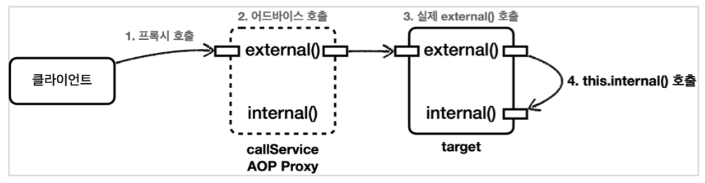 @Autowired를 통해 주입받은 객체는 주입받기 전 이미 AOP가 적용된 프록시 객체이므로 internal() 메서드를 호출하더라도 실제 객체가 호출되지 않는다.