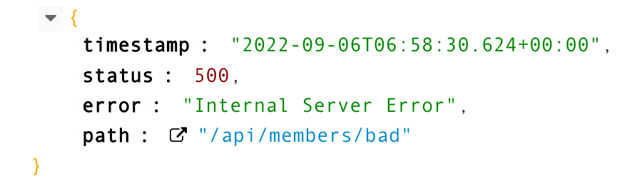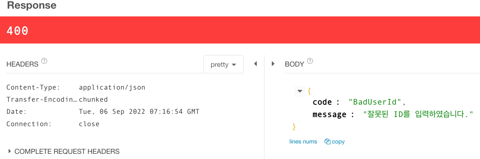 - @ResponseStatus(HttpStatus.BAD_REQUEST) 를 지정했으므로 HTTP 상태 코드 400으로 응답한다.