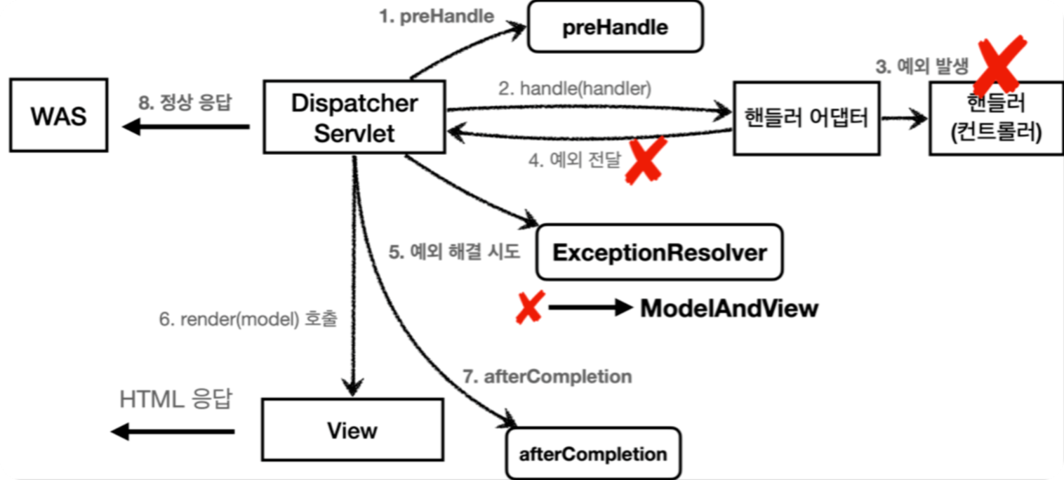 HandlerExceptionResolver를 상속받으면 handler에 대한 정보와 exception 정보를 가지고 예외를 해결할 수 있다. 리턴값으로 ModelAndView 를 반환하는 이유는 마치 try, catch를 하듯이 Exception 을 처리해서 정상 흐름처럼 변경하는 것이 목적이다. 이름 그대로 Exception 을 Resolver(해결)하는 것이 목적이다.