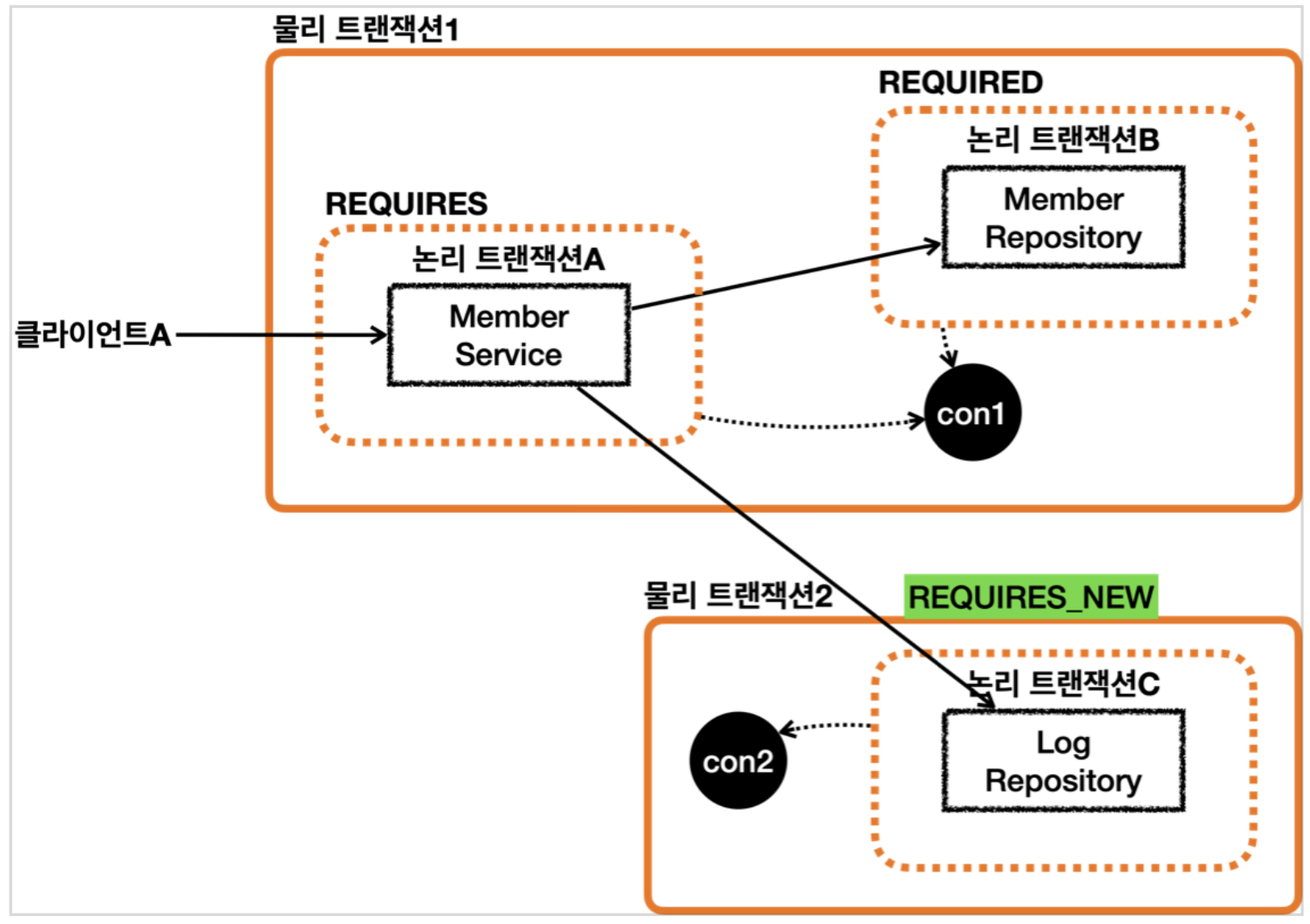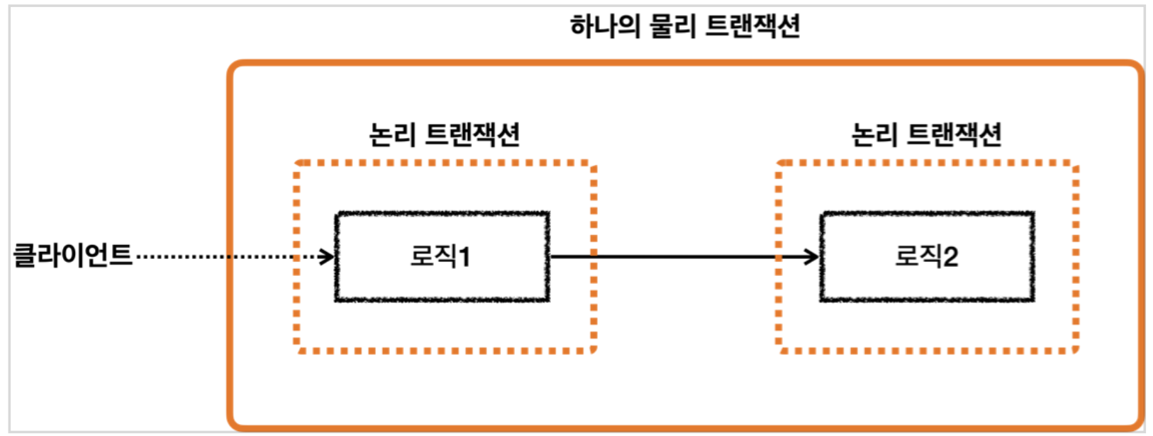 논리 트랜잭션 : 로직 단위이다. 각 로직마다 전파 옵션을 가지며 REQUIRED 를 적용했다면 동일한 물리 트랜잭션 안에서 실행되므로 정책도 같아진다. 만약 물리 트랜잭션을 분리 시키고 싶다면 REQUIRES_NEW을 적용하면 된다.