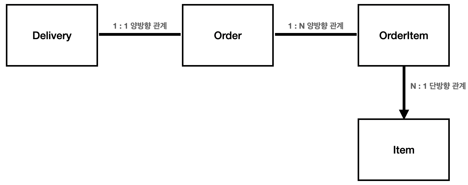 Order를 중심으로 Delivery와 1:1 양방향 관계, OrderItem과는 1:N 양방향 관계가 맺어있고 OrderItem은 Item과 N:1 단방향 관계를 맺고 있다.