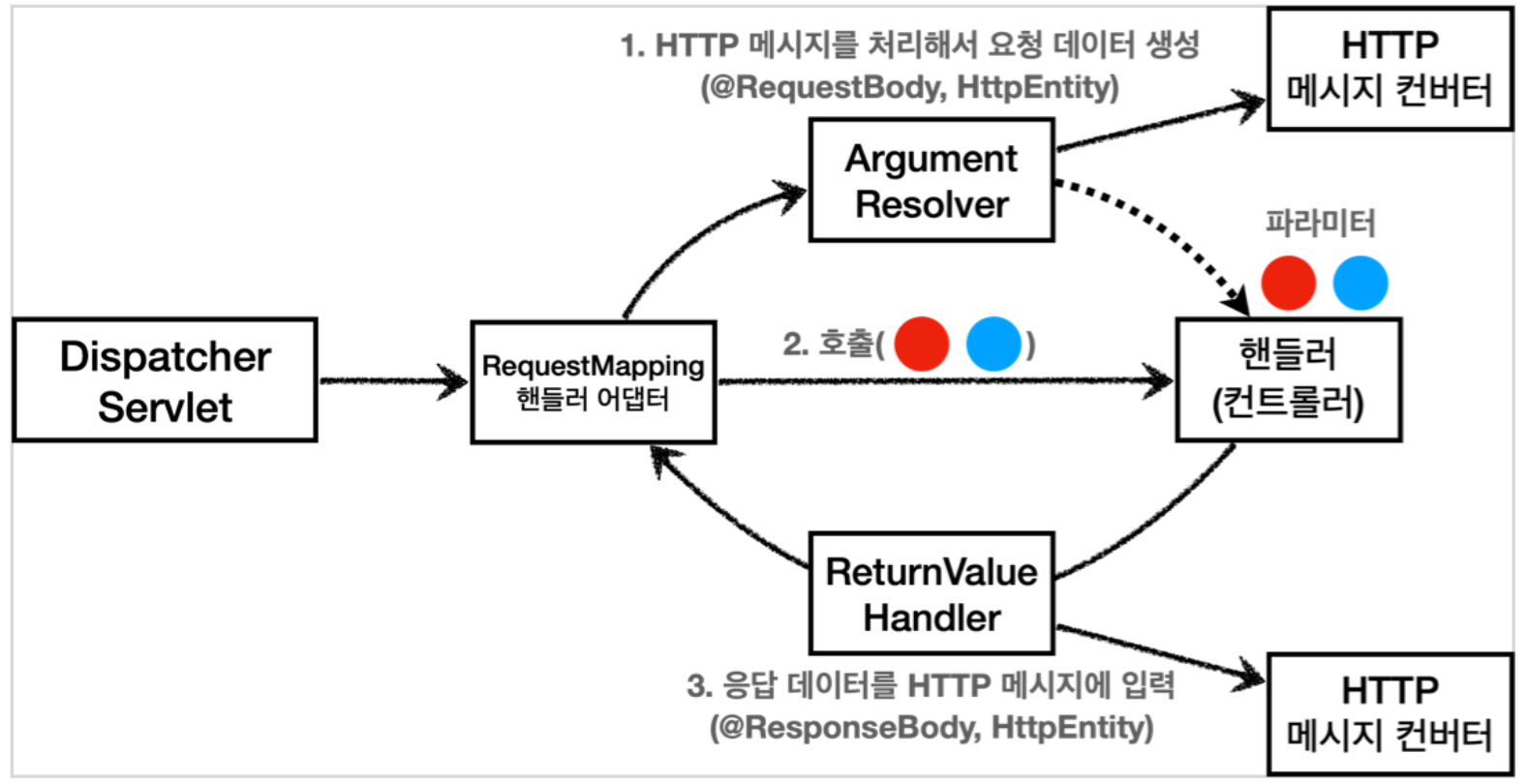 사실 두 리졸버는 직접적으로 변환을 시켜주는 것이 아니다. 리졸버는 핸들러에 적용된 애너테이션이나 파라미터 타입, 리턴 타입 등을 보고 어떻게 하면 데이터를 상황에 맞춰 변환할 수 있는지 지원을 해주는 역할을 하고, 직접적으로 변환을 시켜주는 역할은 HttpMessageConverter가 한다.